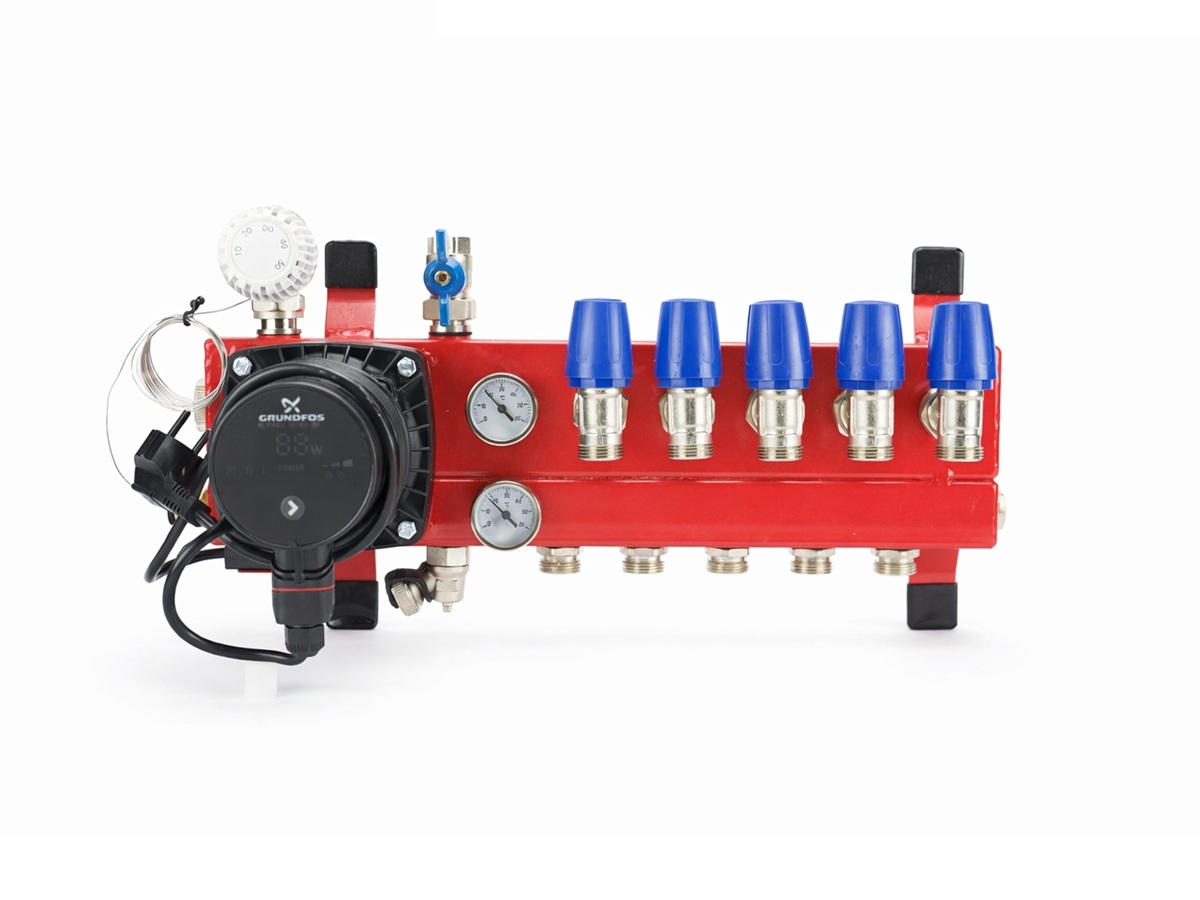 De stalen LTV-verdeler bestaat uit een voorgemonteerde stalen constructie met circulatiepomp, thermometer en dubbel instelbare groepsafsluiters.
