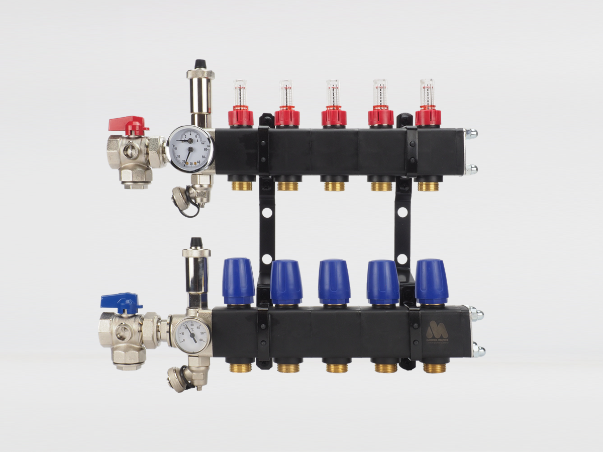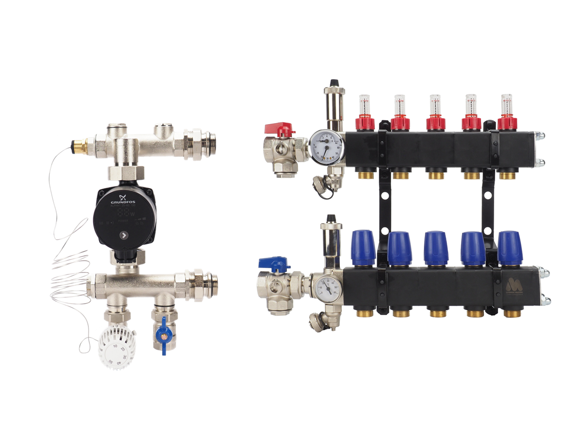 Verder is de temperatuur mengunit voorzien van een regelventiel waarmee de hoeveelheid mengwater vanuit de vloer begrensd kan worden. Hierdoor wordt de verdeler steeds actiever, waardoor meer warm water vanuit de primaire aanvoer naar binnen wordt genomen. Hierdoor is deze regelunit uitermate geschikt voor laagtemperatuur-trajecten, waarbij nog wel moet worden teruggemengd om de correcte vloertemperatuur te bereiken. Mocht u in de toekomst overstappen op een (hybride) warmtepomp, dan kan de regelunit worden aangepast met een hybride-uitbreidingsset of u verwijderd de unit, zodat er een open kunststof verdeler overblijft.