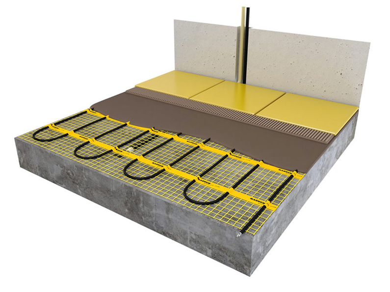 De verwarmingskabel is gelijkmatig bevestigd op een glasvezelnet (met een lus- afstand van ca. 10 cm). De isolatie van deze kabel is gemaakt van TEFLON en de beschermmantel is van PVC, daardoor is de verwarmingskabel zeer duurzaam en 100% waterdicht. Hierdoor zijn alle verwarmingsmatten geschikt voor installatie in geheel natte ruimtes. Daarnaast is de verwarmingskabel van deze mat voorzien van een unieke, blinde verbinding tussen verwarmings- en aansluitkabel.