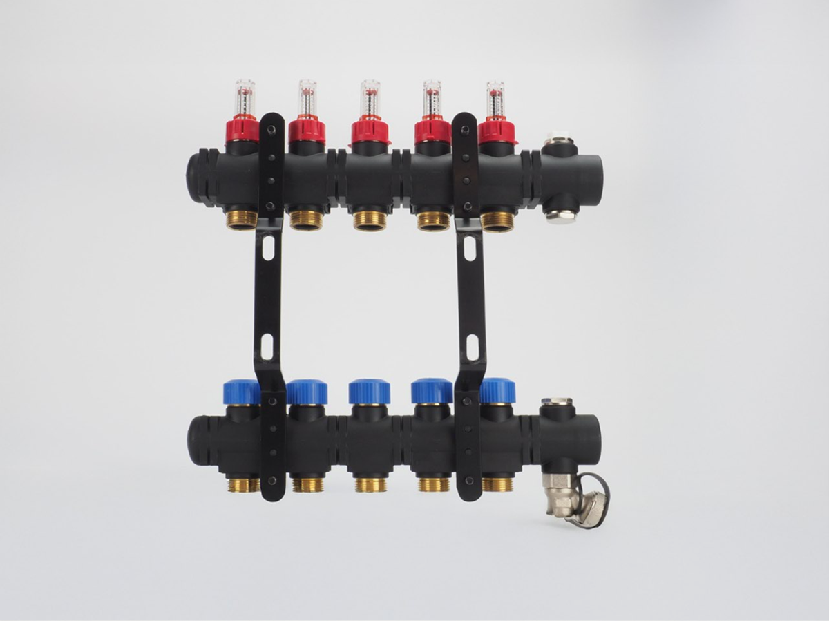Deze uitvoering van de MAGNUM EcoFlow open kunststof verdeler bestaat uit een kunststof module uit één geheel. Deze module is vervaardigd van een met glasvezel versterkte polyamide, waardoor hij bestand is tegen zowel hoge als lage temperaturen. Dit maakt deze verdeelunit uitermate geschikt voor zowel verwarmen als koelen, bijvoorbeeld in combinatie met een hybride warmtepomp die in de winter warmte levert en in de zomer koelt. Standaard is deze basis uitvoering voorzien van een handmatige ontluchter en inregelbare flowmeters.