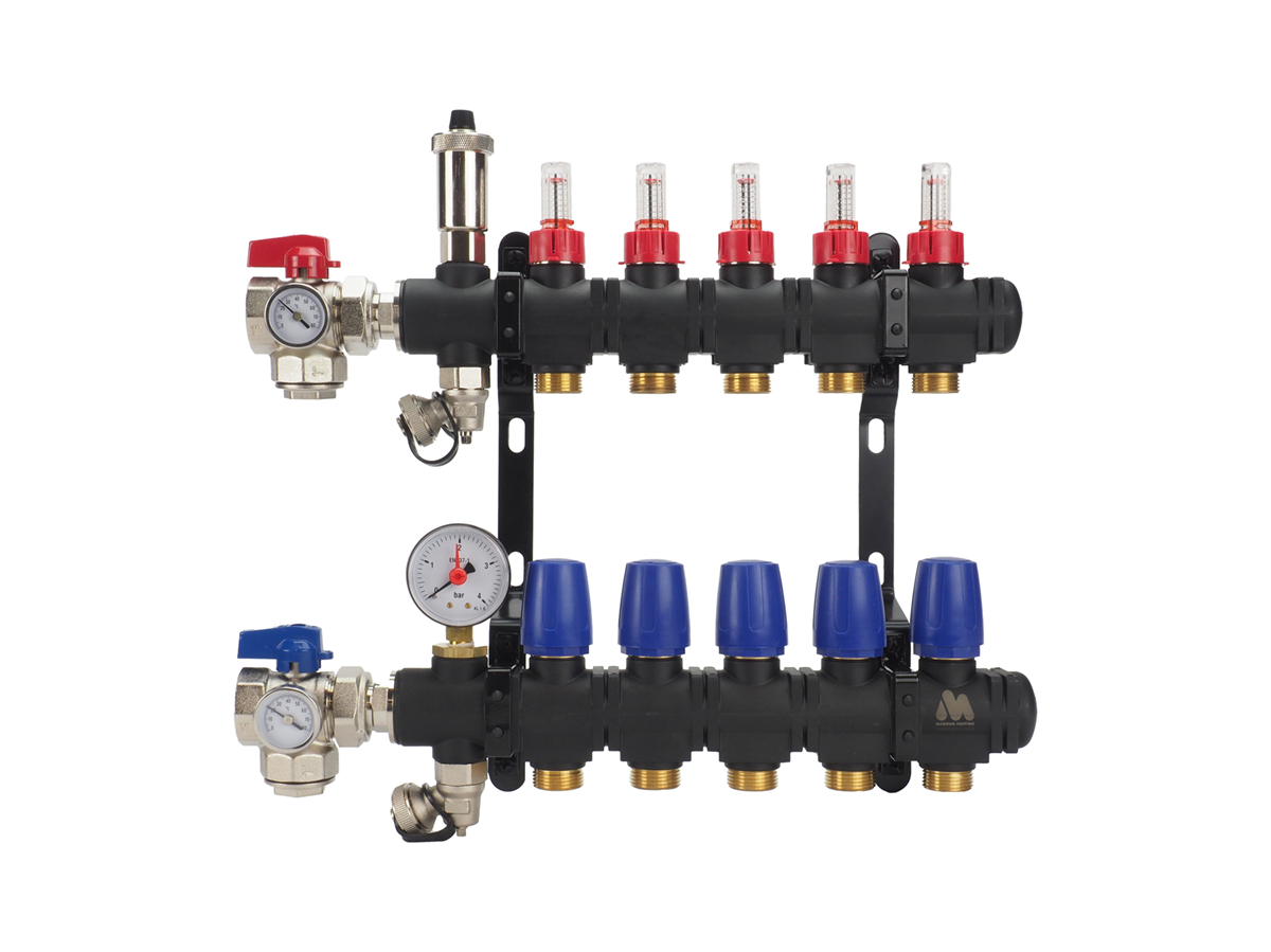 De MAGNUM EcoFlow open kunststof verdeler bestaat uit een kunststof module uit één geheel. Deze module is vervaardigd van een met glasvezel versterkte polyamide, waardoor hij bestand is tegen zowel hoge als lage temperaturen. Dit maakt deze verdeelunit uitermate geschikt voor zowel verwarmen als koelen, bijvoorbeeld in combinatie met een hybride warmtepomp die in de winter warmte levert en in de zomer koelt. Standaard is deze verdeler voorzien van 1” kogelkranen, een automatische ontluchter en inregelbare flowmeters.