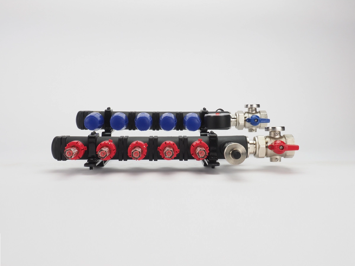 De MAGNUM EcoFlow open kunststof verdeler bestaat uit een kunststof module uit één geheel. Deze module is vervaardigd van een met glasvezel versterkte polyamide, waardoor hij bestand is tegen zowel hoge als lage temperaturen. Dit maakt deze verdeelunit uitermate geschikt voor zowel verwarmen als koelen, bijvoorbeeld in combinatie met een hybride warmtepomp die in de winter warmte levert en in de zomer koelt. Standaard is deze verdeler voorzien van 1” kogelkranen, een automatische ontluchter en inregelbare flowmeters.