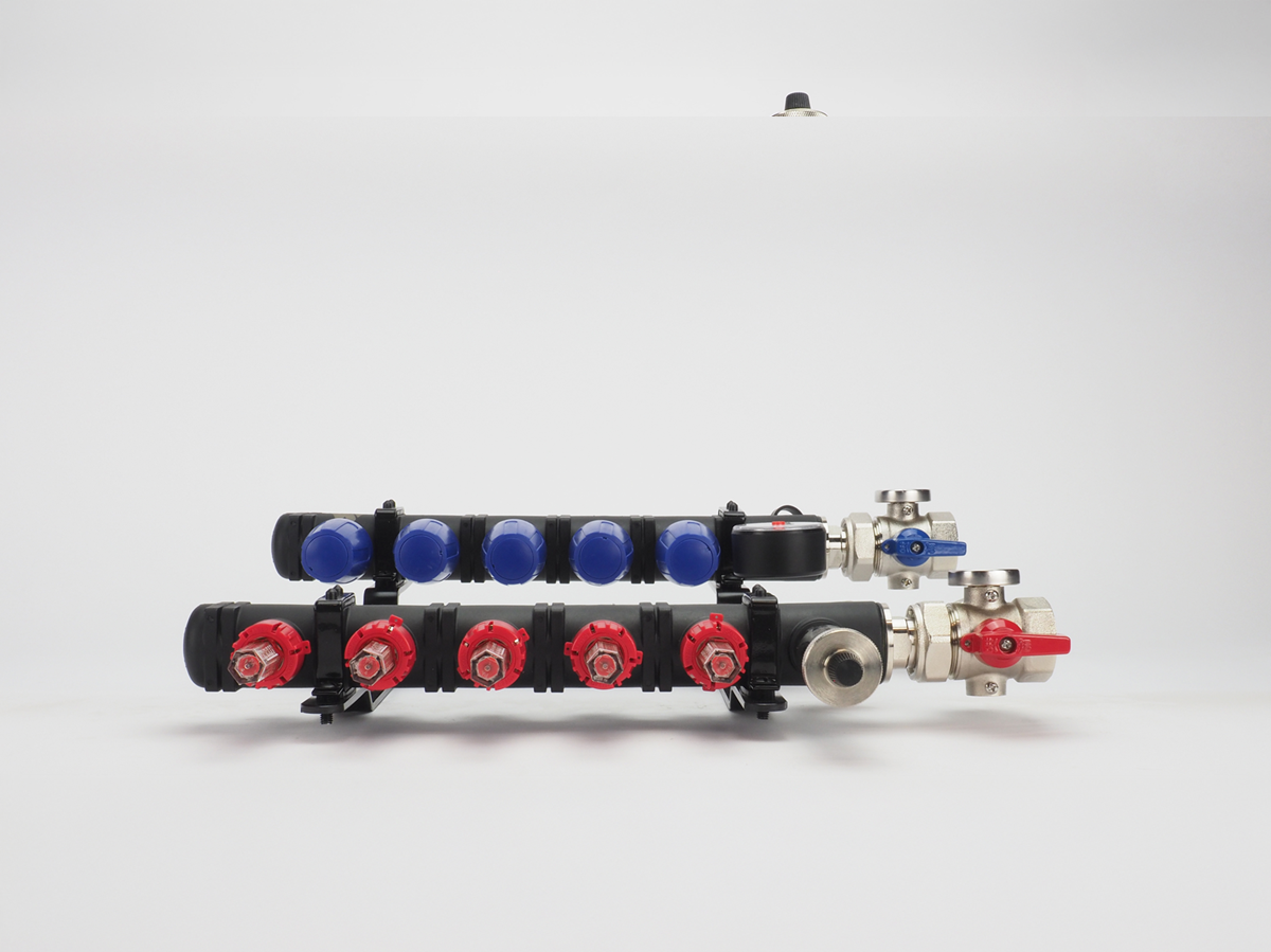 De MAGNUM EcoFlow open kunststof verdeler bestaat uit een kunststof module uit één geheel. Deze module is vervaardigd van een met glasvezel versterkte polyamide, waardoor hij bestand is tegen zowel hoge als lage temperaturen. Dit maakt deze verdeelunit uitermate geschikt voor zowel verwarmen als koelen, bijvoorbeeld in combinatie met een hybride warmtepomp die in de winter warmte levert en in de zomer koelt. Standaard is deze verdeler voorzien van 1” kogelkranen, een automatische ontluchter en inregelbare flowmeters.