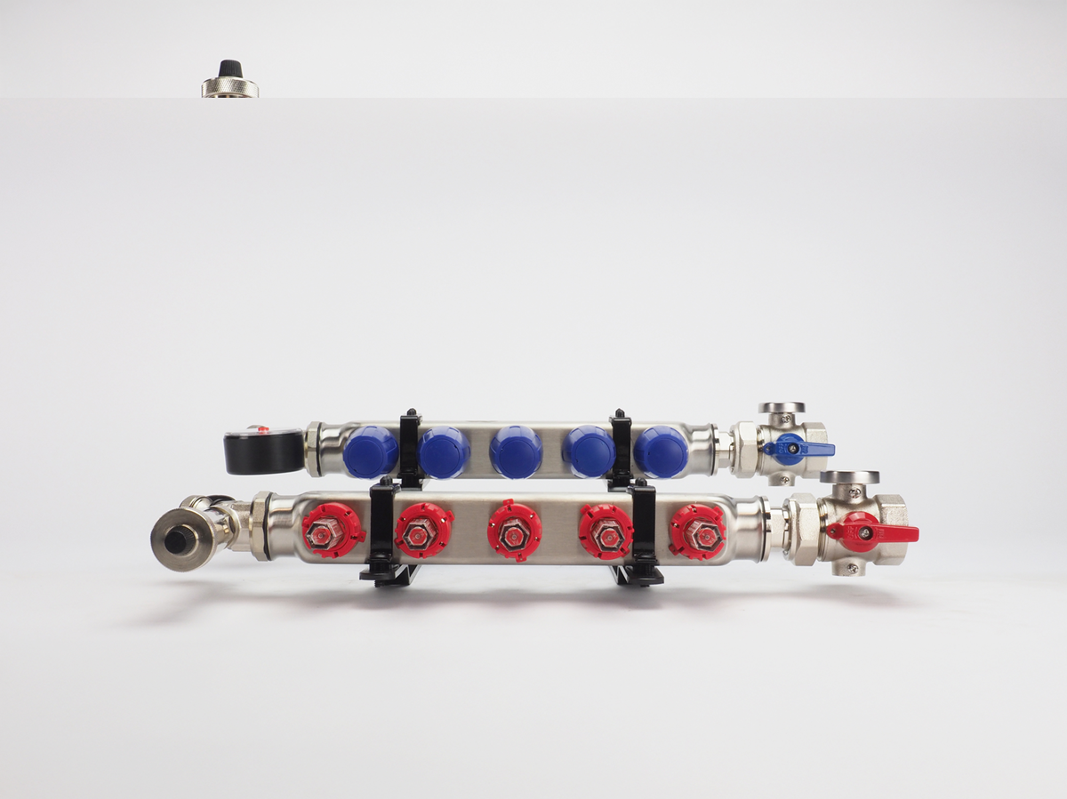 Dit type verdeler kan geschikt gemaakt worden voor verwarmingssystemen met hogere aanvoertemperaturen vanaf 50°C door middel van de temperatuurregelaar.