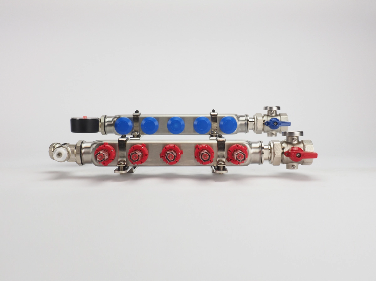Dit type verdeler kan geschikt gemaakt worden voor verwarmingssystemen met hogere aanvoertemperaturen vanaf 50°C door middel van de temperatuurregelaar.