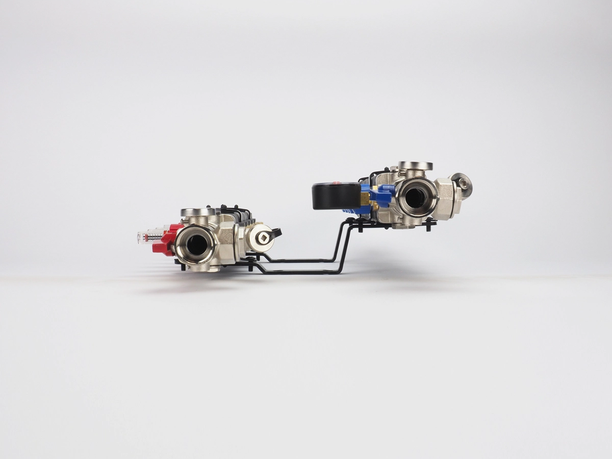 vul-/aftapkraan aanvoer met kogelafsluiter, 1" thermometer aanvoer handmatige ontluchter inregelbare flowmeter aanvoer vloerverwarmingsbuizen retour met kogelafsluiter, 1" thermometer retour vul-/aftapkraan manometer thermostatische afsluiter met M30 draad retour vloerverwarmingsbuizen |