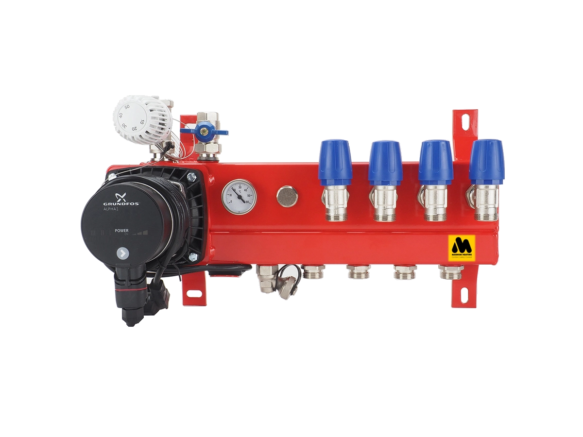 De stalen mengverdeler bestaat uit een voorgemonteerde stalen constructie met circulatiepomp, thermometer en dubbel instelbare groepsafsluiters.